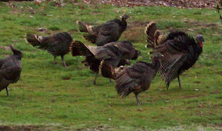 We were driving home, and a gaggle of ( I know geese) or a herd of Turkeys were on a neighbors front yard.. Sorry if they are a bit blurred, but they were starting to run.. Further down the road the old pear tree, that must have been planted in the days of the prospectors and large ranchers had lost it's leaves and the pears are showing up..